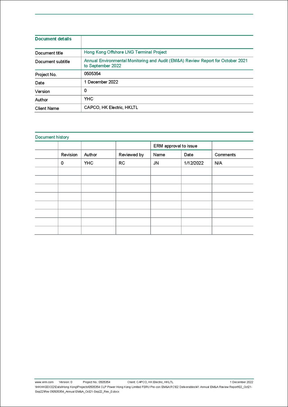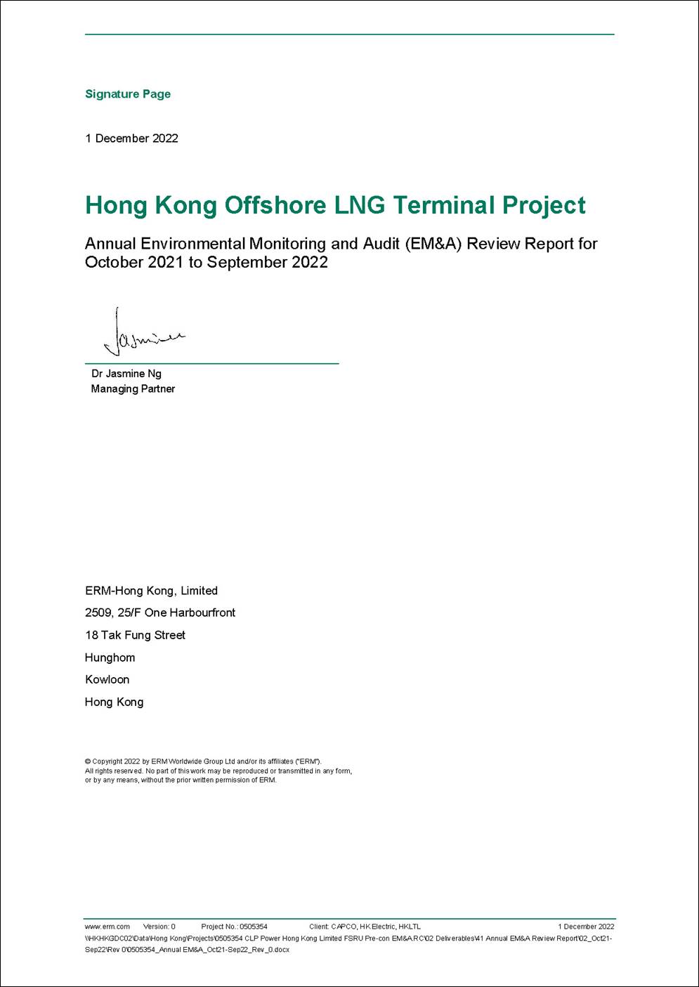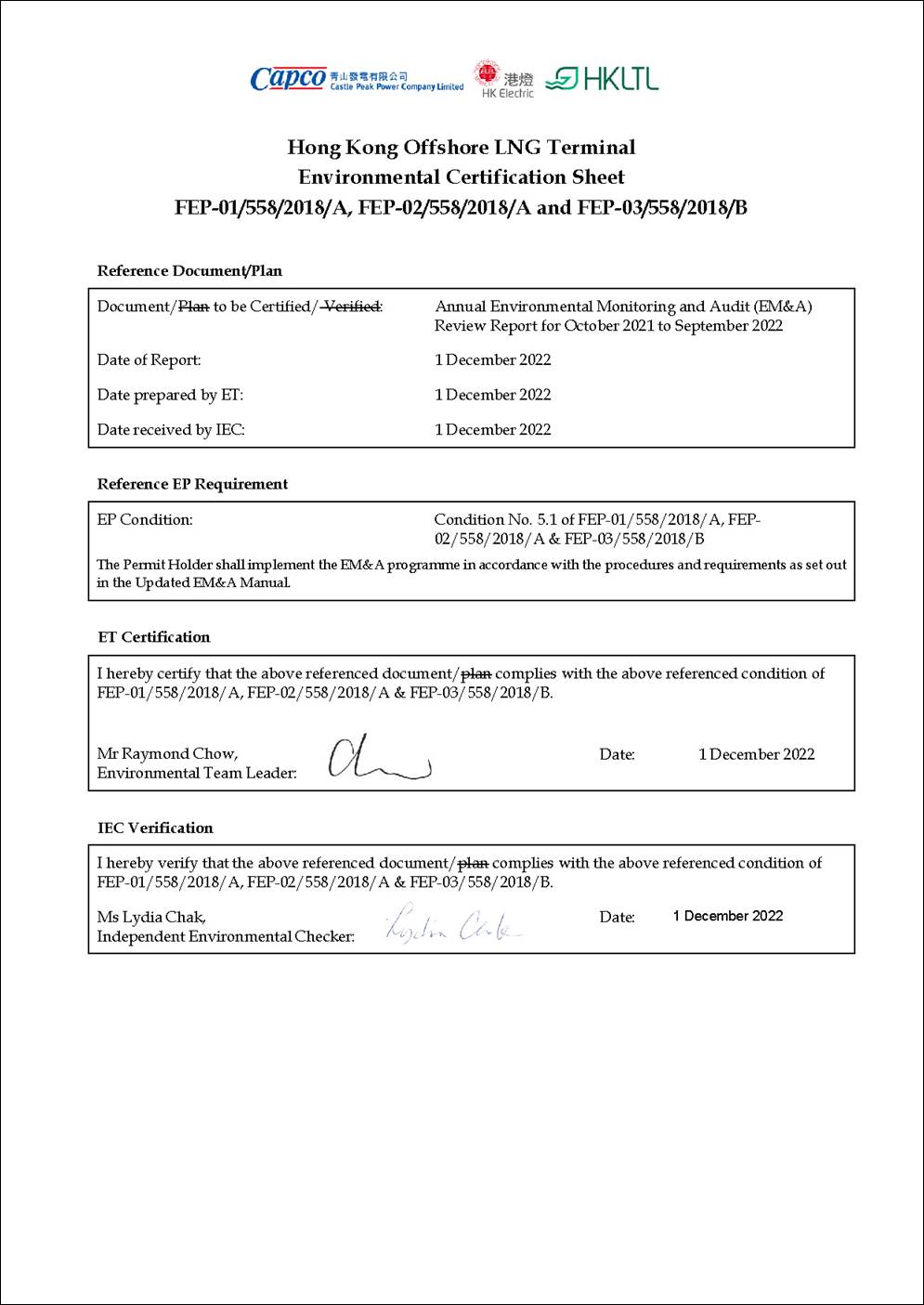 § the double berth jetty at LNG Terminal under the Hong Kong LNG Terminal Limited (HKLTL), joint venture between CAPCO and HK Electric (FEP-01/558/2018/A) – construction commenced on 27 November 2020;