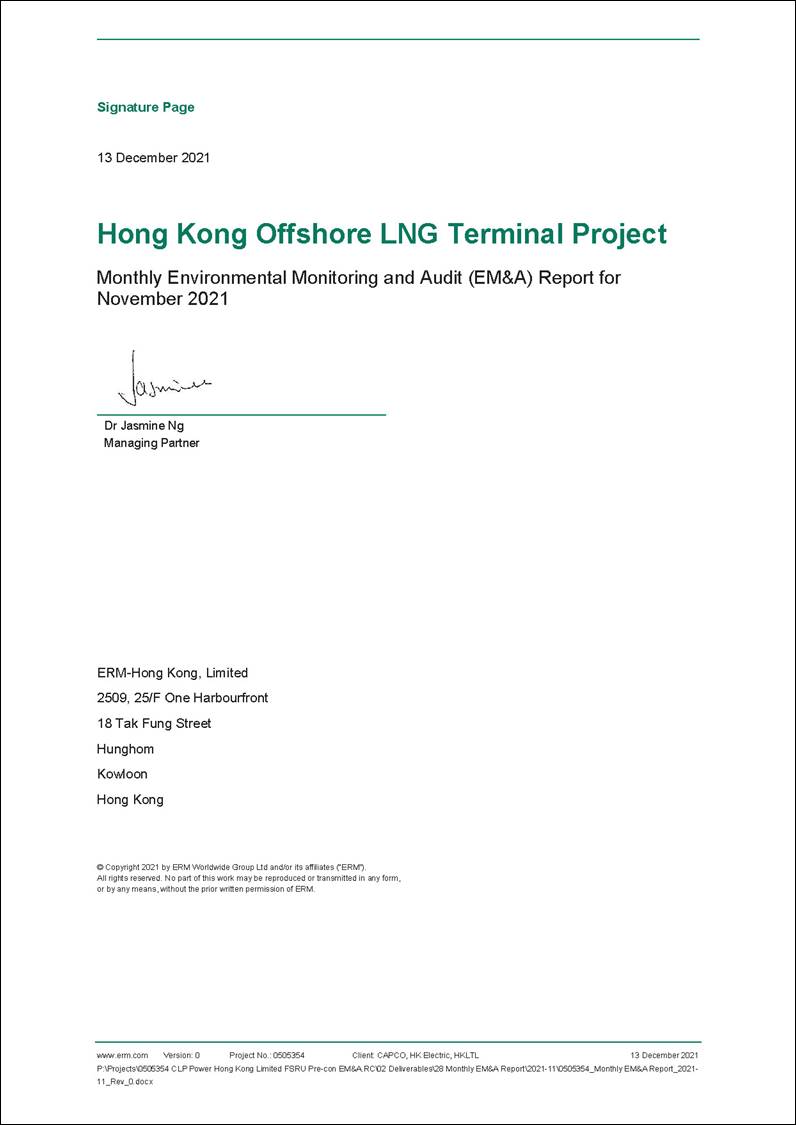 To support the increased use of natural gas in Hong Kong from 2020 onwards, Castle Peak Power Company Limited (CAPCO) and The Hongkong Electric Co., Ltd. (HK Electric) have identified that the development of an offshore liquefied natural gas (LNG) receiving terminal in Hong Kong using Floating Storage and Regasification Unit (FSRU) technology (‘the Project’) presents a viable additional gas supply option that will provide energy security through access to competitive gas supplies from world markets.  The Project will involve the construction and operation of an offshore LNG import facility to be located in the southern waters of Hong Kong, a double berth jetty, and subsea pipelines that connect to the gas receiving stations (GRS) at the Black Point Power Station (BPPS) and the Lamma Power Station (LPS).  To demarcate the works between different parties, the following Further Environmental Permits (FEPs) were issued for the Project: