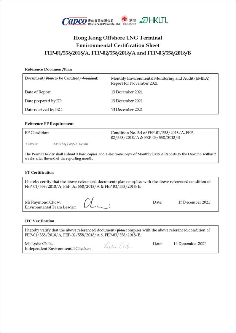 As the marine mammal monitoring is recommended to determine the efficacy of the recommended mitigation measures and provide verification of impact prediction/ evaluation results which is specific to the impact from underwater sound from Jetty pile installation works, the marine mammal monitoring for construction phase is considered completed in November 2021 following the completion of jacket installation works (i.e. piling works) of the Project.  No further construction phase marine mammal monitoring (both vessel-based line transect marine mammal surveys and passive acoustic monitoring) is necessary to be conducted for the remaining works (i.e. topside construction) under the EM&A programme as consulted with EPD and AFCD in late November 2021.