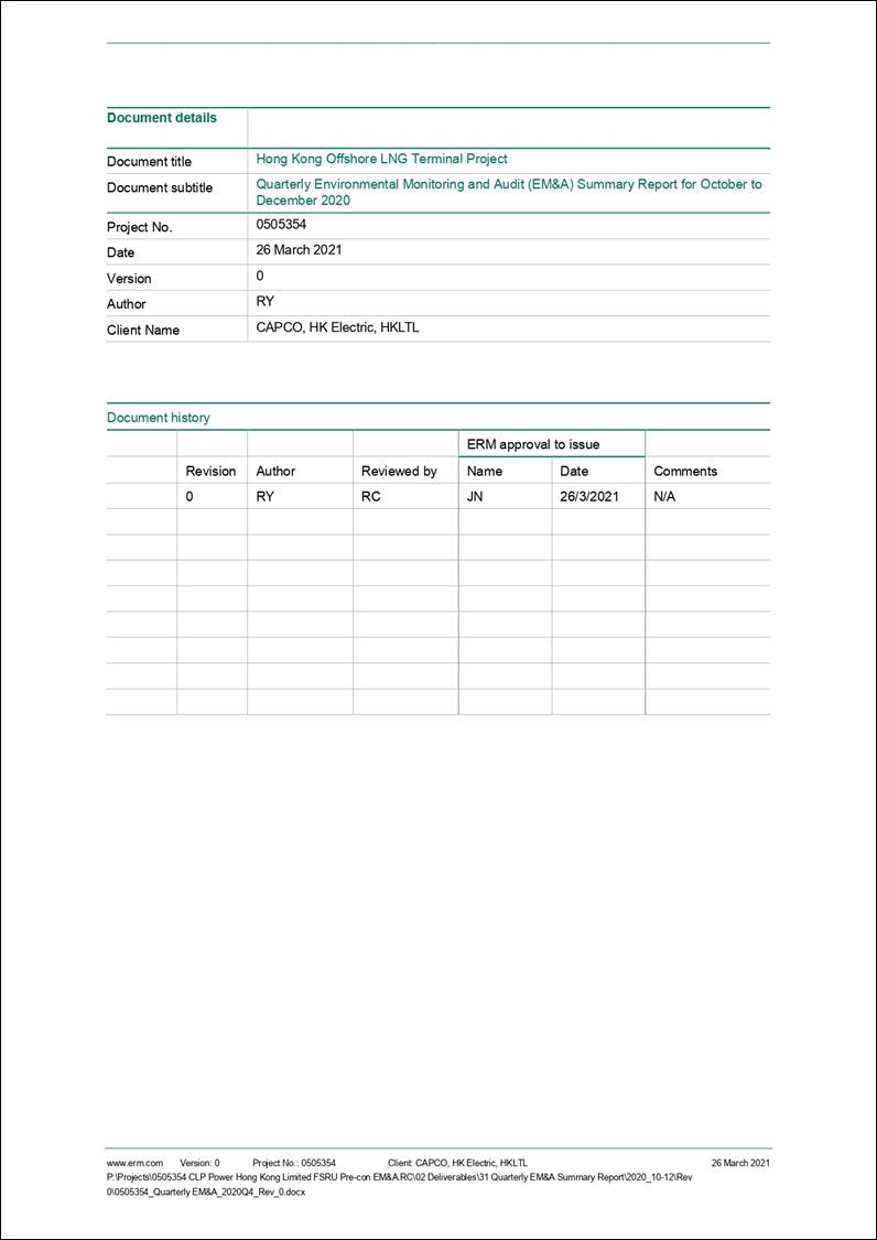To support the increased use of natural gas in Hong Kong from 2020 onwards, Castle Peak Power Company Limited (CAPCO) and The Hongkong Electric Co., Ltd. (HK Electric) have identified that the development of an offshore liquefied natural gas (LNG) receiving terminal in Hong Kong using Floating Storage and Regasification Unit (FSRU) technology (‘the Project’) presents a viable additional gas supply option that will provide energy security through access to competitive gas supplies from world markets.  The Project will involve the construction and operation of an offshore LNG import facility to be located in the southern waters of Hong Kong, a double berth jetty, and subsea pipelines that connect to the gas receiving stations (GRS) at the Black Point Power Station (BPPS) and the Lamma Power Station (LPS).  To demarcate the works between different parties, the following Further Environmental Permits (FEPs) were issued for the Project: