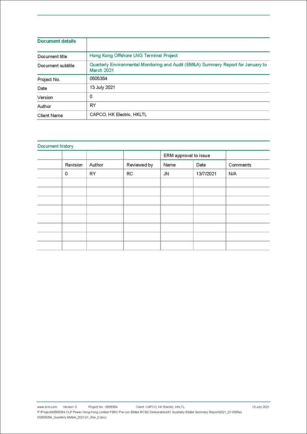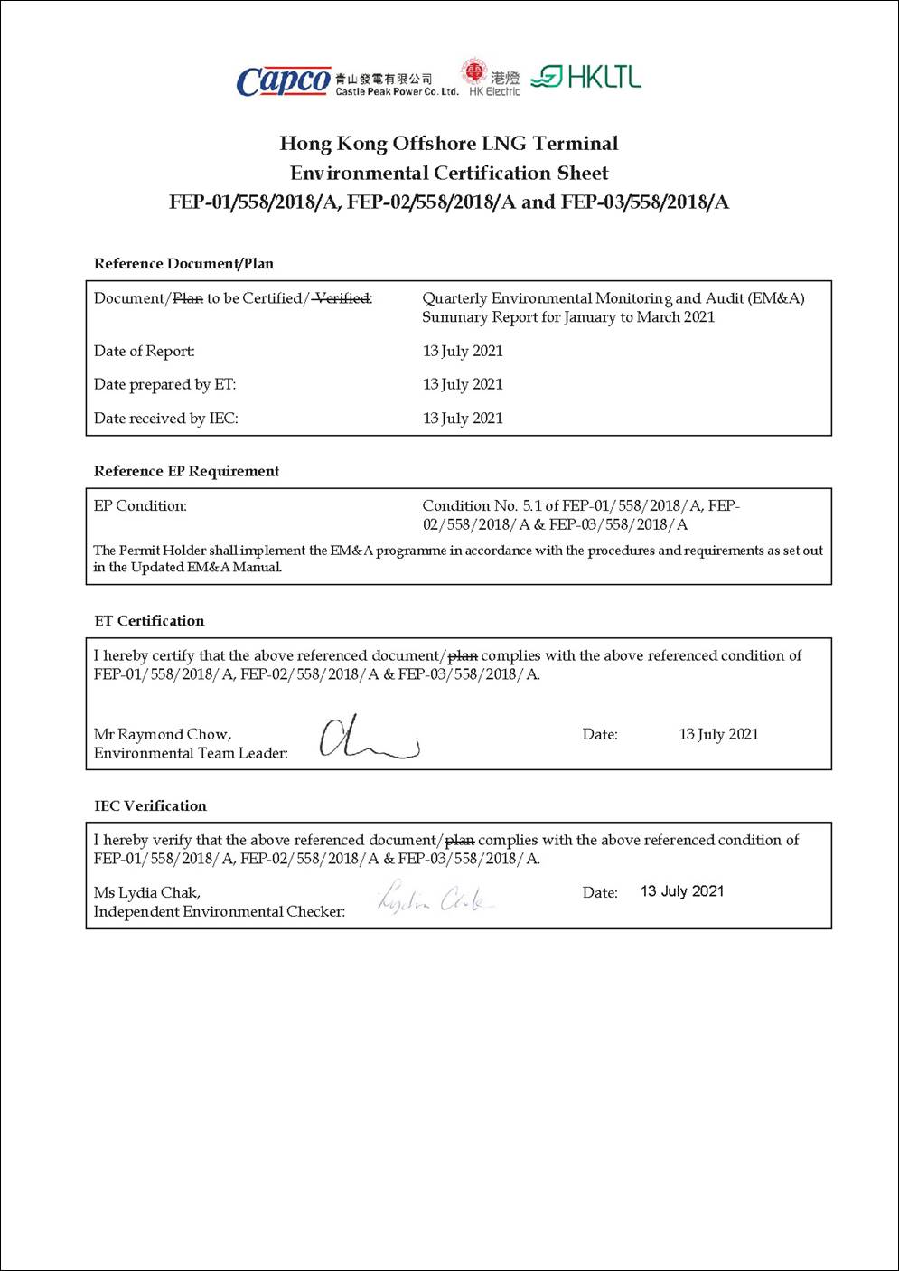 §   the double berth jetty at LNG Terminal under the Hong Kong LNG Terminal Limited (HKLTL), joint venture between CAPCO and HK Electric (FEP-01/558/2018/A) – construction commenced on 27 November 2020;