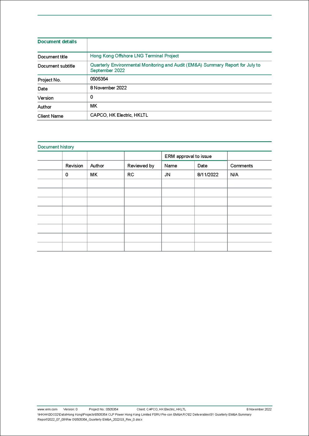 To support the increased use of natural gas in Hong Kong from 2020 onwards, Castle Peak Power Company Limited (CAPCO) and The Hongkong Electric Co., Ltd. (HK Electric) have identified that the development of an offshore liquefied natural gas (LNG) receiving terminal in Hong Kong using Floating Storage and Regasification Unit (FSRU) technology (‘the Project’) presents a viable additional gas supply option that will provide energy security through access to competitive gas supplies from world markets.  The Project will involve the construction and operation of an offshore LNG import facility to be located in the southern waters of Hong Kong, a double berth jetty, and subsea pipelines that connect to the gas receiving stations (GRS) at the Black Point Power Station (BPPS) and the Lamma Power Station (LPS).  To demarcate the works between different parties, the following Further Environmental Permits (FEPs) were issued for the Project:
