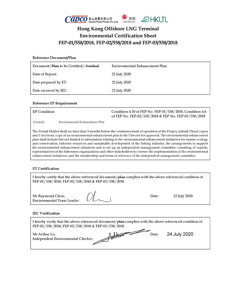 “The Permit Holder shall, no later than 3 months before the commencement of operation of the Project, submit 3 hard copies and 1 electronic copy of an environmental enhancement plan to the Director for approval. The environmental enhancement plan shall include but not limited to information relating to the environmental enhancement initiatives for marine ecology and conservation, fisheries resources and sustainable development of the fishing industry, the arrangements to support the environmental enhancement initiatives and to set up an independent management committee consisting of experts, representatives of the fishermen organizations and other stakeholders to oversee the implementation of the environmental enhancement initiatives, and the membership and terms of reference of the independent management committee.”