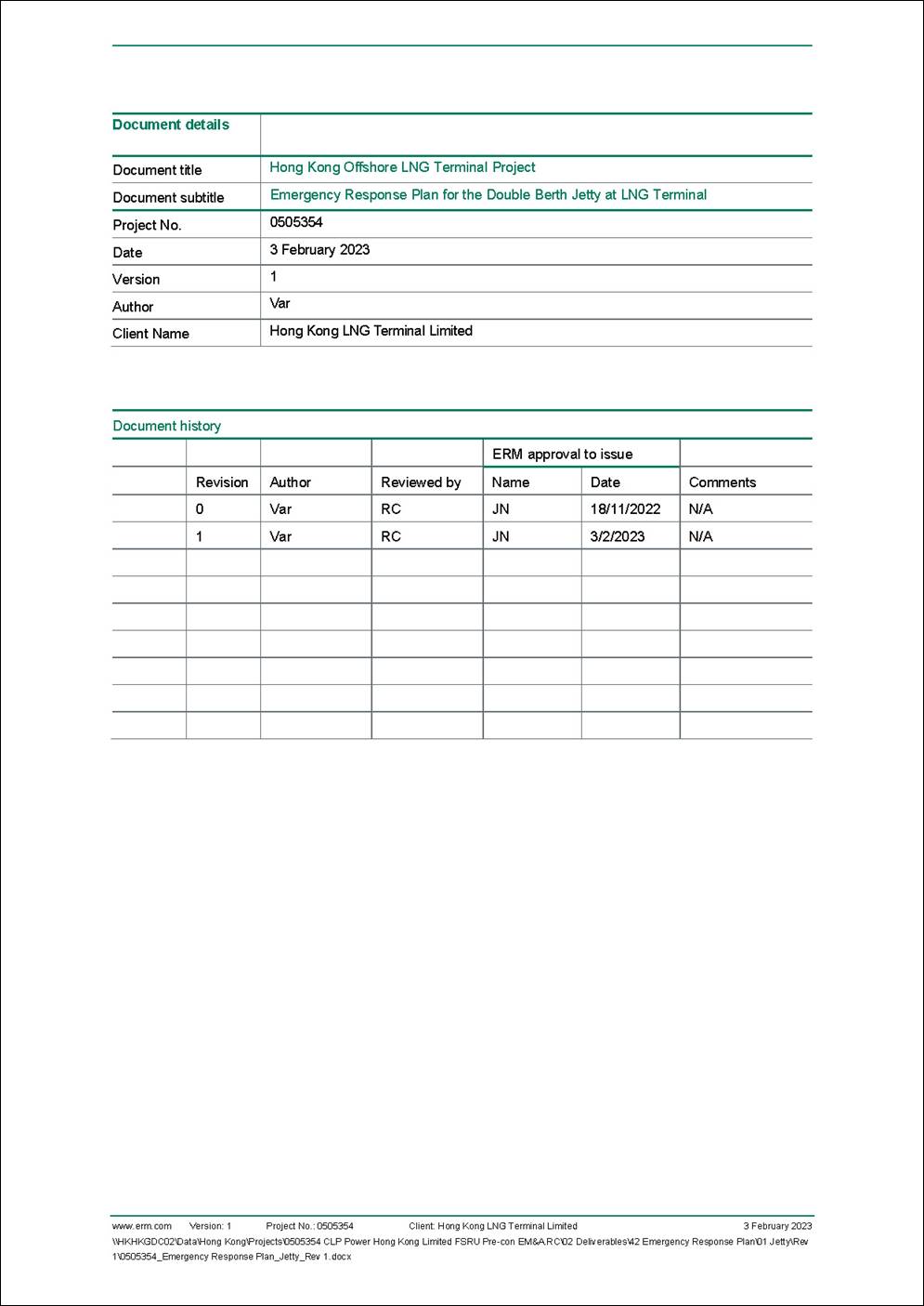 This Emergency Response Plan covers the works associated with the double berth jetty at the LNG Terminal.