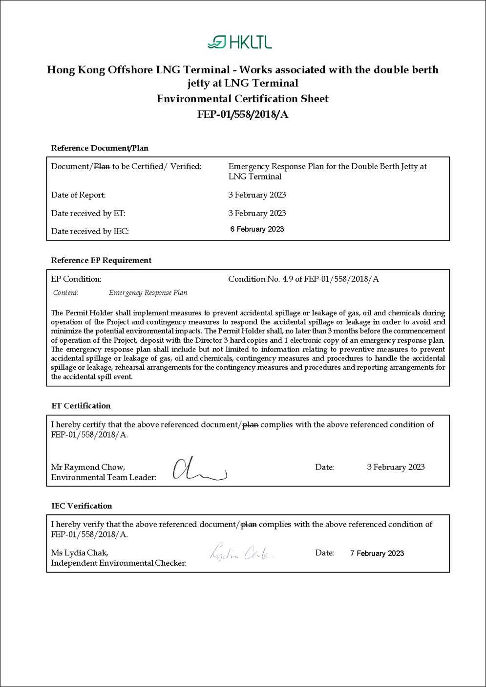 In accordance with Condition 4.9 of the FEP of the LNG Terminal (FEP-01/558/2018/A) (‘the Project’):