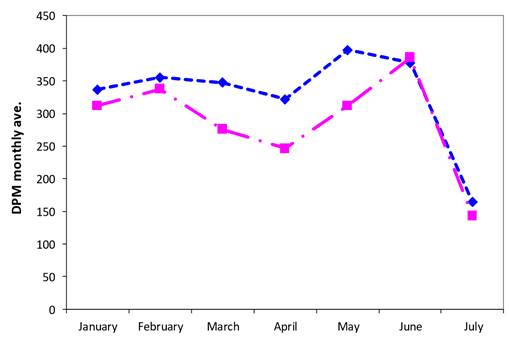 Continuous PAM data was only available between 6 January 2017 and 27 July 2017 from the two deployment locations in the vicinity of the LNG Terminal (i.e. Locations 2 and 3, Figure 2.1). Monthly averages of the seven-month period (i.e. January through July) were calculated from the daily total of DPMs at the two deployment locations, for the examination of monthly variations in porpoise occurrences.