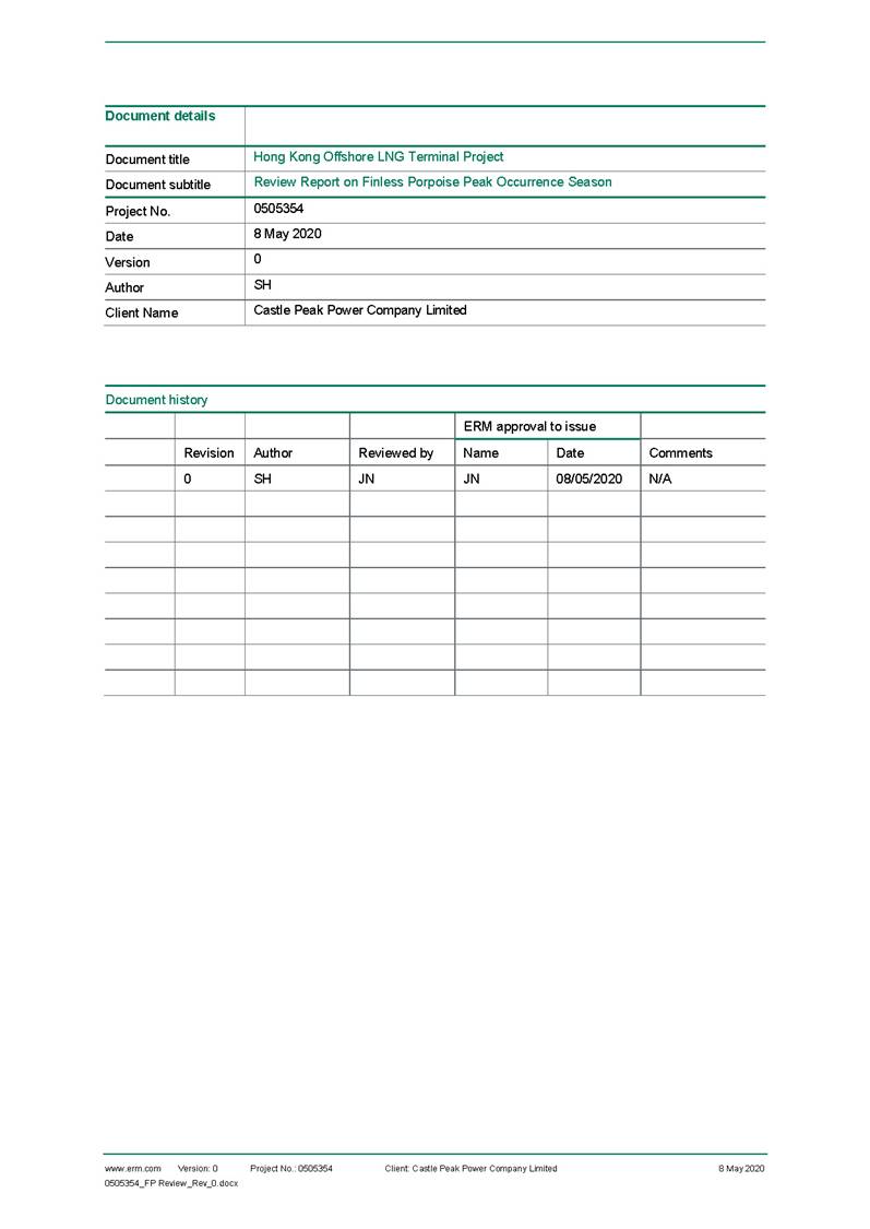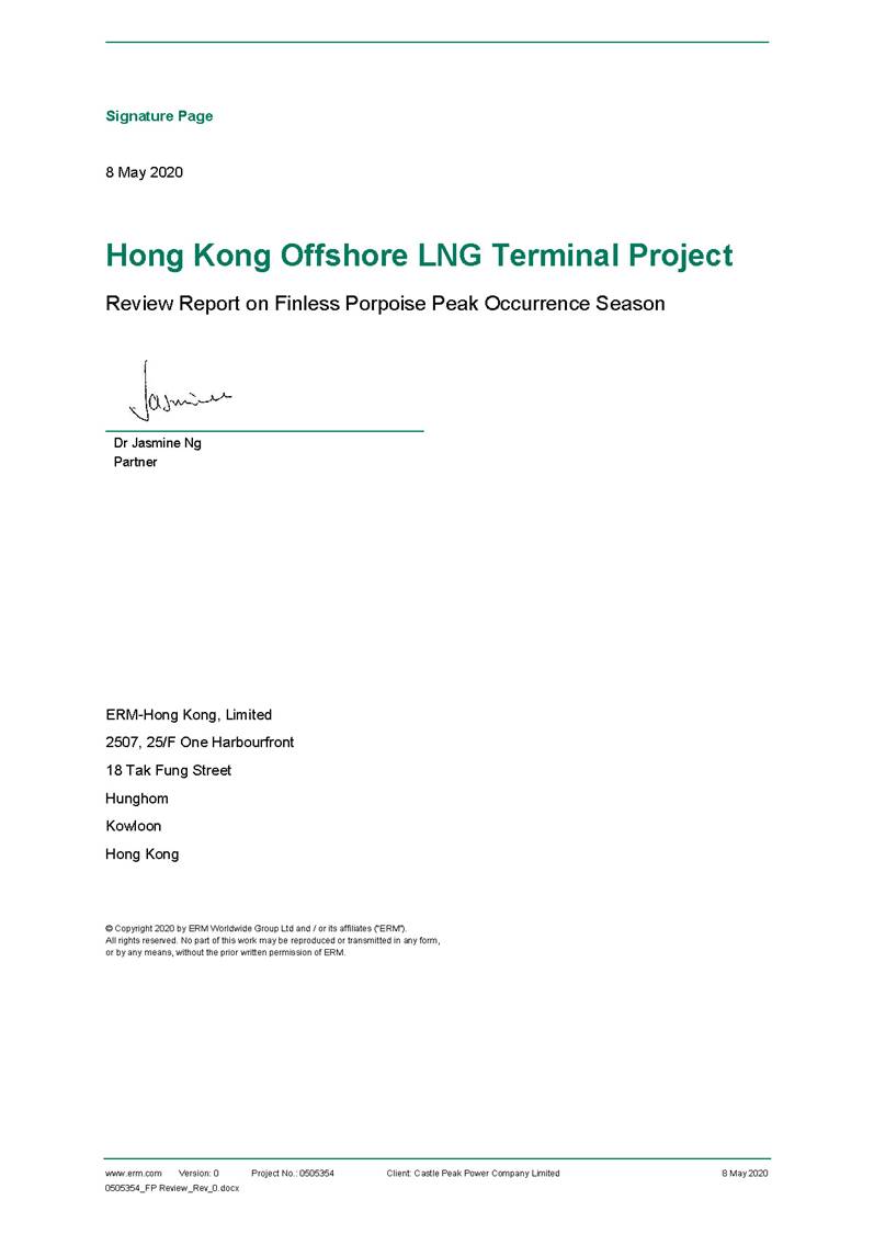 In this Review Report, finless porpoise monitoring data from vessel based survey from April 2009 to March 2019 and passive acoustic monitoring from January to July 2017 at two deployment locations have been reviewed. Both sets of data have been examined for monthly variation, which offers analyses with a more in-depth and finer resolution than previously analysed. A further examination on monthly variations in porpoise occurrences suggested that the period between January and June appears to be the peak months of porpoise occurrences for the waters in the vicinity of the LNG Terminal site, which is supported by both vessel-based line-transect survey data as well as the passive acoustic monitoring data.