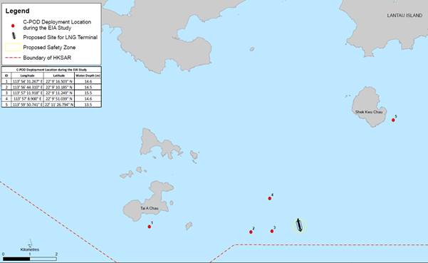 The EIA Study reported the PAM data from the C-POD units deployed in the vicinity of the LNG Terminal (i.e. West of HKOLNG, namely Location 2), from 204 logged days during the period of 6 January 2017 to 30 June 2017. Subsequent to the completion of the EIA Study, further data were retrieved from C-POD units once thought to be lost. This included PAM data from Location 2 collected from 7 June 2017 to 27 July 2017, and from a location closer to the LNG Terminal (namely Location 3) collected from 6 January 2017 to 27 July 2017. These data were also analysed and evaluated in this review.