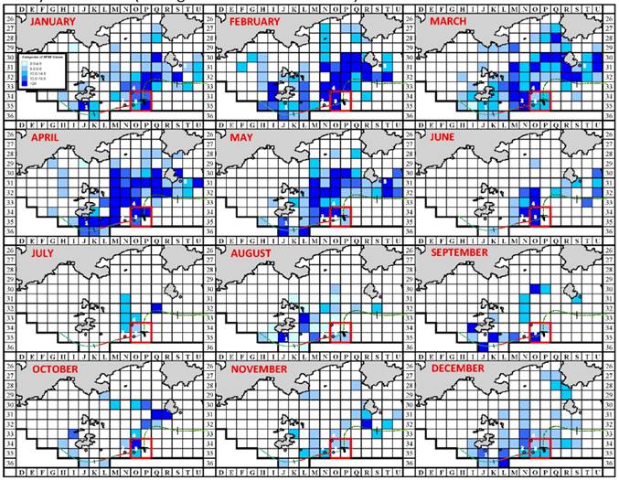 Figure 4.1 Spatial patterns on monthly variations in sighting densities of porpoises (SPSE values) in South Lantau waters, utilizing AFCD long-term marine mammal monitoring data collected between April 2009 and March 2019 (red square: four grids surrounding the LNG Terminal site)