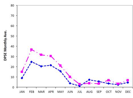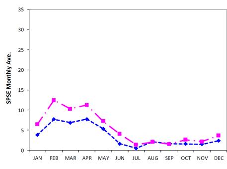 Figure 4.3 Temporal variations in monthly averages of SPSE values (top) and DPSE values (bottom of finless porpoises at: 1) entire South Lantau region (137 grids), 2) SEL survey area (68 grids)