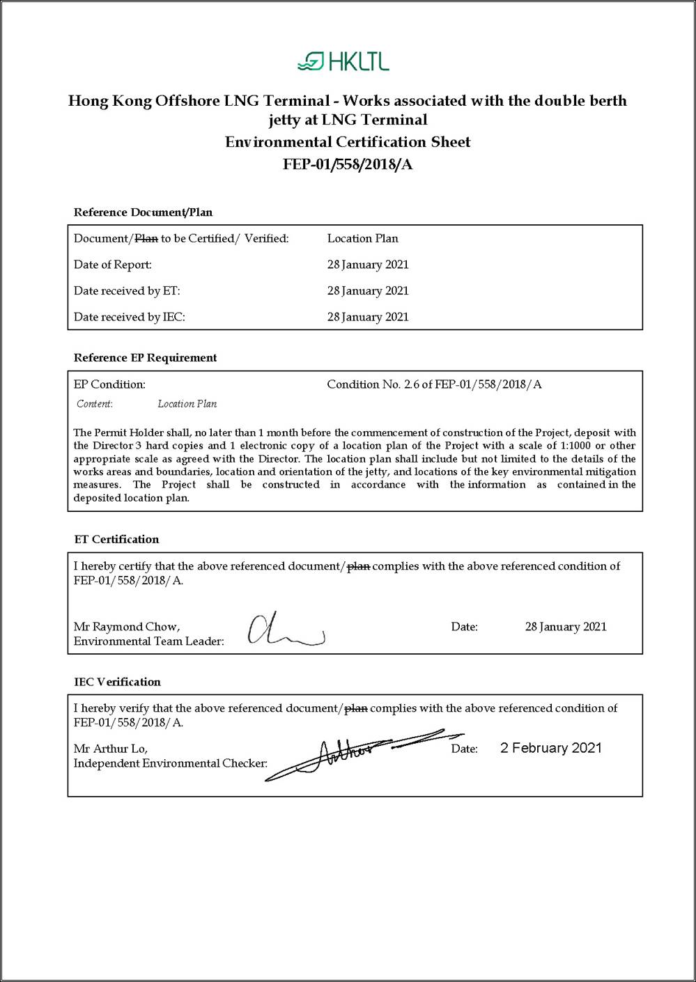 FEP No. FEP-01/558/2018/A, Condition 2.6: “The Permit Holder shall, no later than 1 month before the commencement of construction of the Project, deposit with the Director 3 hard copies and 1 electronic copy of a location plan of the Project with a scale of 1:1000 or other appropriate scale as agreed with the Director. The location plan shall include but not limited to the details of the works areas and boundaries, location and orientation of the jetty, and locations of the key environmental mitigation measures. The Project shall be constructed in accordance with the information as contained in the deposited location plan.” |